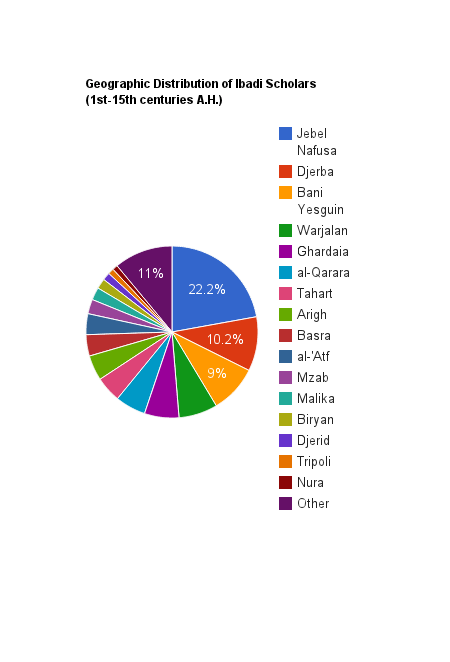 Geographic Distribution of Ibāḍī scholars November 10, 2013June 14, 2017 / ibadistudies Data from: Bābāʿammī et al, Muḥammad Ṣāliḥ Nāṣir, ed. Muʿjam ʾaʿlām al-ibāḍiyya (Dictionnaire des hommes illustres de l’Ibadisme, les hommes du Maghreb). Beirut: Dār al-Gharb al-Islāmī, 2000. Share this: Click to share on X (Opens in new window) X Click to share on Facebook (Opens in new window) Facebook Like Loading... Related