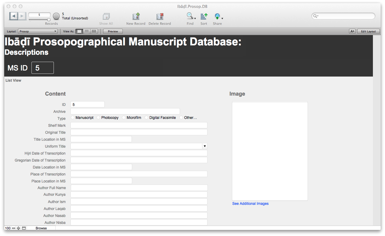 The following is a screenshot of a database manuscript entry form I am building to record the corpus of extant manuscript copies of five major prosopographical Ibāḍī works. These five works, also available in print editions, are housed in numerous libraries throughout North Africa and Europe. Just in case someone happens to know of a private library containing a copy of any of these five works, I would appreciate them letting me know. The five works are: