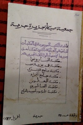 رجعت إلى جزيرة جربة أول الشهر لكي أبحث عن معلومات متعلّقة بالمكتبات الخاصة هناك. زرت جمعية صيانة الجزيرة في حومة السوق لكي أرى قائمة المخطوطات الموجودة في بعض المكتبات العائلية التي دوّنت بمناسبة معرض وثائق الجزيرة في أفريل ١٩٨٧. طبعا، تعطلت مصوّري قبل أن أصوّر القائمة ولكنّني أردت أن أضع الفهرس هنا للآخرين. من الواضح من الصورة أن نسخة القائمة الموجودة في مكتبة الجمعية غير كاملة. من ناحية المخطوطات الإباضية ، أتصوّر أن مكتبة عائلة البعطوري لها أثمن مجموعة من المخطوطات. بالإضافة إلى المكتبات المذكورة هنا، توجد مخطوطات في جامع الماي فضلا عن المخطوطات في المكتبة المعروفة لدى عائلة الشيخ المرحوم سالم بن يعقوب. لما تكون لدي الفرصة، أتمنّى أن أرجع للجمعية وأصوّر القائمة بكاملها وأضعها هنا للتنزيل الإلكتروني.
