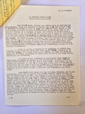 My recent trip in March to the Archives Nationales d’Outre Mer in Aix-en-Provence [1] France yielded a fascinating collection of documents from the private archive of French Orientalist Roger LeTourneau (1907-1971). The “Fond LeTourneau” [APOM7/1-29] is made up of 29 cartons of personal papers, notes, letters, and other documents donated to the archives following LeTourneau’s death [2]. Once I finish arranging my notes, I intend to upload a copy of my inventory of all 29 cartons for the benefit of others.