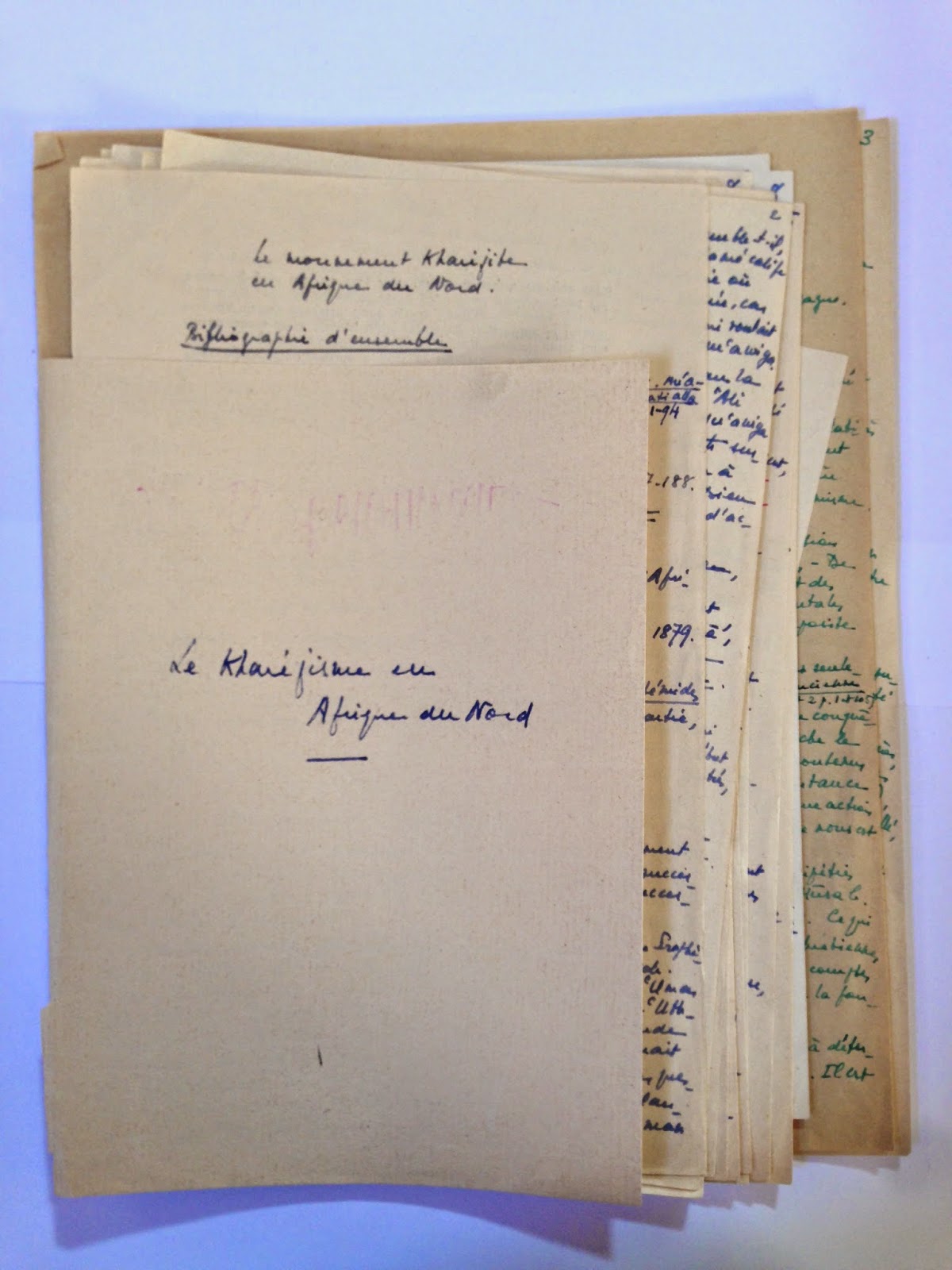The first, which is the reason for my visit to the archives, was his work on the Kitāb al-sīra wa akhbār al-aʾimma of Abū Zakarīyāʾ al-Wārjalānī (d.11th c.). I’ll be dealing with those documents in detail in the dissertation. The second, more unexpected collection of documents relates to his often-cited article on the revolt of Abū Yazīd ‘al-Nukkārī’ against the Fatimids in the early 10th century. The stages of research for this article, which he ultimately published in Les Cahiers de Tunisie in 1953 [4], can be followed step by step in his personal archive [see photo]. As someone currently in the process of conducting research and writing, I found it fascinating to watch as LeTourneau researched, edited, and revised this study from beginning to end. The second photo is a stack of his lecture notes for his course on medieval Islamic North Africa that he offered at the University of Aix following his move there from Algeria.