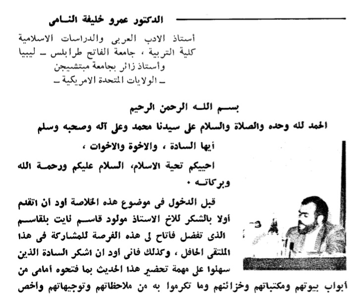 | The first page from Ennami’s article on Warjalan, delivered in Guerrara. The article presents Ennami (pictured here) with the titles of Professor at the Al-Fātiḥ University in Tripoli and Visiting Professor at the University of Michigan. The French translation says the lecture was given in January of 1966, but I suspect this is a typographical error and it was in 1976. |