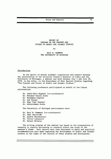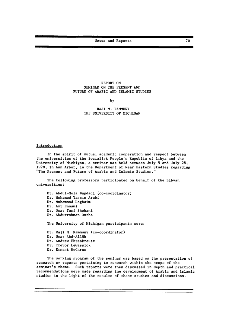 | The first page of report from a 1978 seminar on the “The Present and Future of Arabic and Islamic Studies.” This was a report put together by Dr. Raji Rammuny at the University of Michigan. The seminar was intended to be a dialogue between professors at Michigan and Libyan universities. Both LeGassick and Ennami appear as collaborators. |