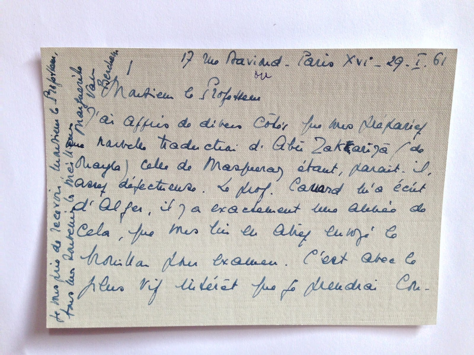 It would be fascinating to know if Van Berchem ever received a drafted copy of LeTourneau’s text, especially the Arabic transcription that never appeared in print. In any case, the letter serves as a reminder that the translation of the Kitāb al-sīra appeared at an important time in the history of Northern Africa. As Van Berchem herself indicates here, Algeria was moving rapidly toward independence from France, which it would achieve one year later in 1962.