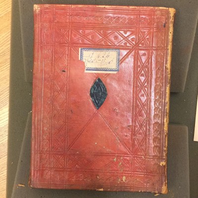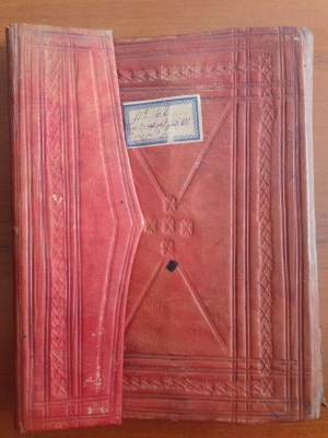 Speaking of other clues…there is another very cool thing about this particular manuscript: its handsome red-orange full leather binding (see photo). Although I have not examined it in person or seen a full facsimile of the manuscript, I can use this additional photo of Evyn’s to offer some details of its history.