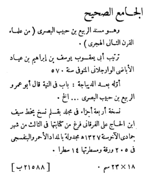 (1) MS bāʾ 21588: a copy of the Ibadi hadith collection known as the Musnad, compiled by Abū Yaʿqūb al-Warjalānī (d.570/1174-75). It is dated 3 Jum II 1327 / 12 Jun 1910 and was copied by Sayf Ibn al-Ḥājj ʿAlī al-Furqānī.