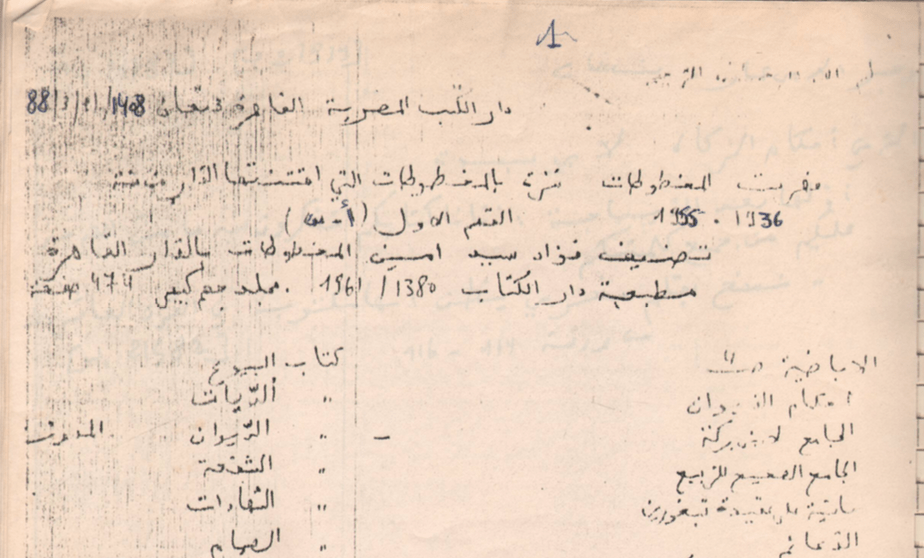 [1] A. Fuʾād Sayyid, Fihrist al-makhṭūṭāt nashra bi-‘l-makhṭūṭāt allatī aqtanathā al-dār min sanat 1936-1955. 3 Vols (1961-1963).