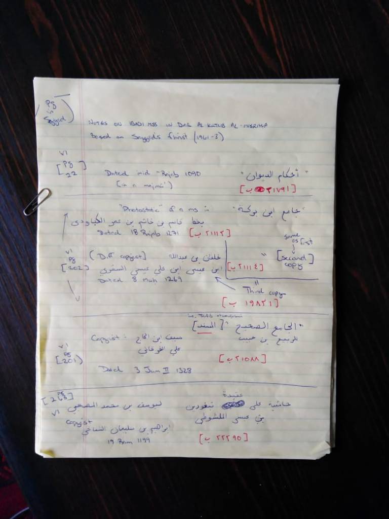 A couple of years ago, I received a photocopy of some handwritten notes on Ibadi manuscripts in the Egyptian National Library, the Dār al-Kutub al-Miṣriyya (Figure 1). The notes are dated 1408/1988 in Cairo, where the copyist was sitting at the library with a copy of A. Fuʾād Sayyid’s catalog of recent (between 1936-55) acquisitions to the library. [1] The opening pages of the catalog comprise a topical index, including an entry on Ibadis.
