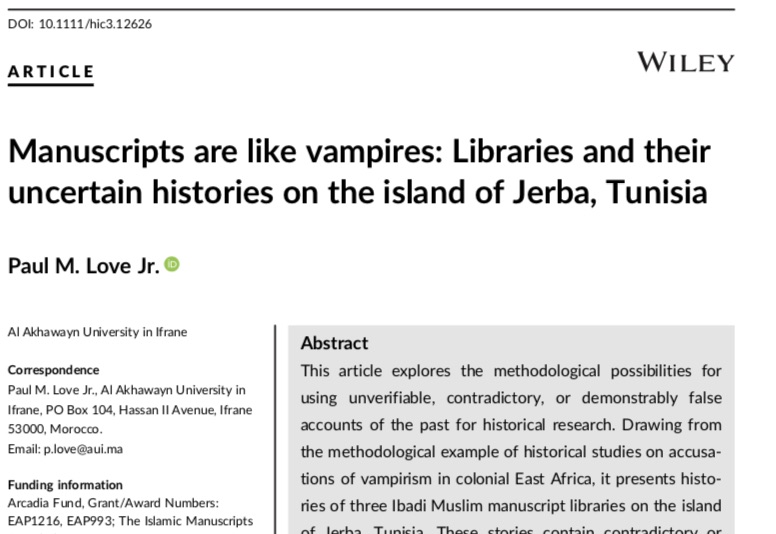 “This article explores the methodological possibilities for using unverifiable, contradictory, or demonstrably false accounts of the past for historical research. Drawing from the methodological example of historical studies on accusations of vampirism in colonial East Africa, it presents histories of three Ibadi Muslim manuscript libraries on the island of Jerba, Tunisia. These stories contain contradictory or otherwise unverifiable elements, each of which raises methodological questions for its use as a historical source. The article argues that by drawing upon the methodological premise of these studies of vampires, historians can approach far more basic questions of historical research regarding chronology, contradictory evidence, and veracity”