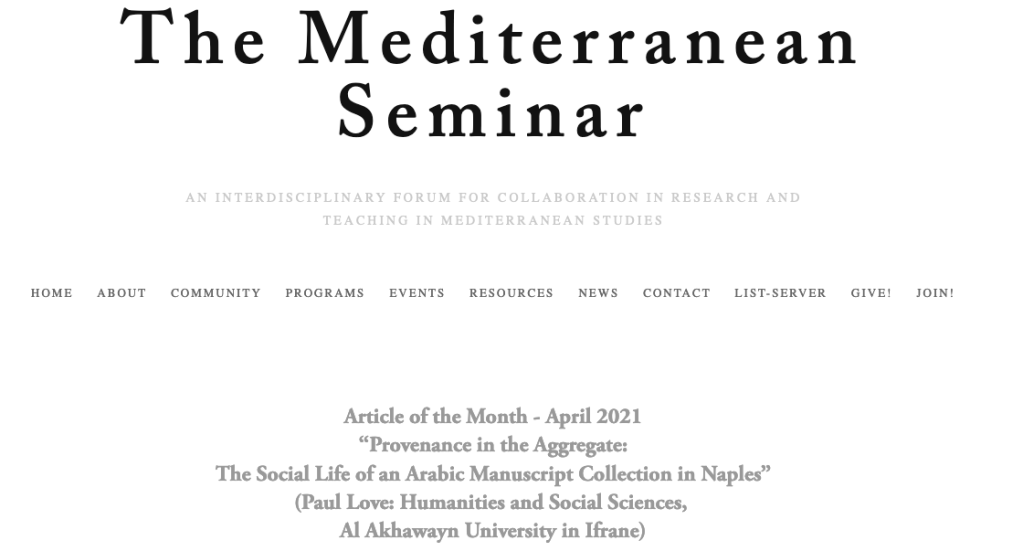 An article of mine on Ibadi manuscripts in Naples published in Manuscript Studies in 2018 received the distinction of article of the Month (April 2021) by the Mediterranean Seminar, which is a wonderful community of scholars working on the Mediterranean. I also had the pleasure of speaking about the article with Professor Sharon Kinoshita (University of California, Santa Cruz) and Professor Brian Catlos (University of Colorado at Boulder) as part of the seminar’s podcast, “Let’s Talk Mediterranean.” You can listen to the interview here.