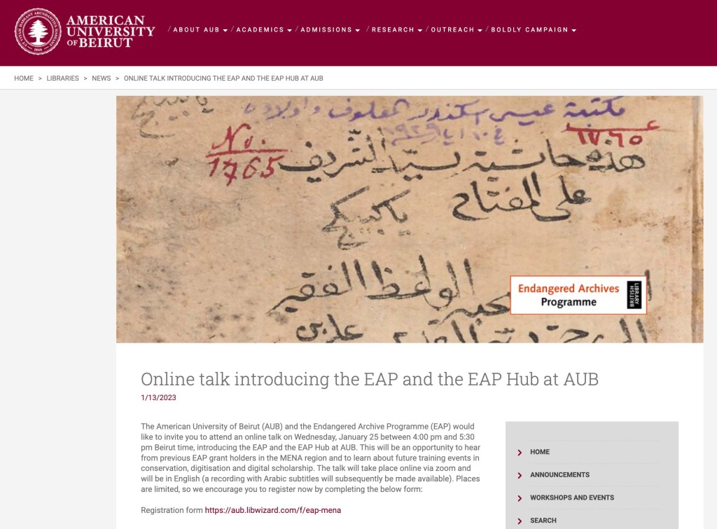 This afternoon (14h00 GMT) I will join a group of colleagues from @bl_eap to talk about our Endangered Archives Programme projects to digitize manuscripts and early Arabic print books in #Djerba #Tunisia and to introduce the new regional hub of EAP at the @AUB_Lebanon. Join us by registering at the link below