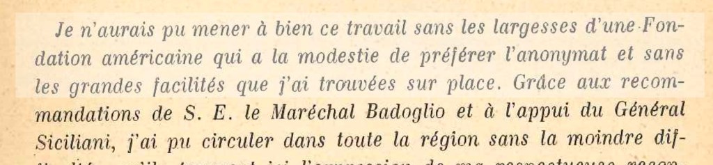In the introduction to Le Djebel Nefousa, he wrote that his work was supported by an American organization which wishes to remain unnamed (see photo). Alongside his many notes of thanks to Italian colonial officials from the government and the military, I found this note intriguing. What was this “American foundation”?
