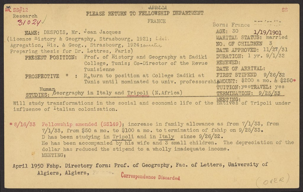 I was interested in a few details of this document, which offer insight into Despois’ fieldwork that would really never have been possible to know without it. The first is that we learn that Despois was based in Tripoli during his fieldwork in 1932-33, accompanied by his wife and three children. The second is that we know the precise amount he received for his funding ($200 USD/month, later increased by $50 USD to account for the “depreciation of the dollar[, which] ha[d] reduced the stipend to a wholly inadequate income.” We also learn that he intended to return to Tunis, which indeed he did the following year, after accepting a new position at the Lycée Carnot. In 1937, he joined the prestigious Faculté des Letters d’Alger and took over the editing of the Revue Africaine in 1941. He would leave Algiers for the Sorbonne in Paris in 1957, just as the Algerian Revolution was beginning.