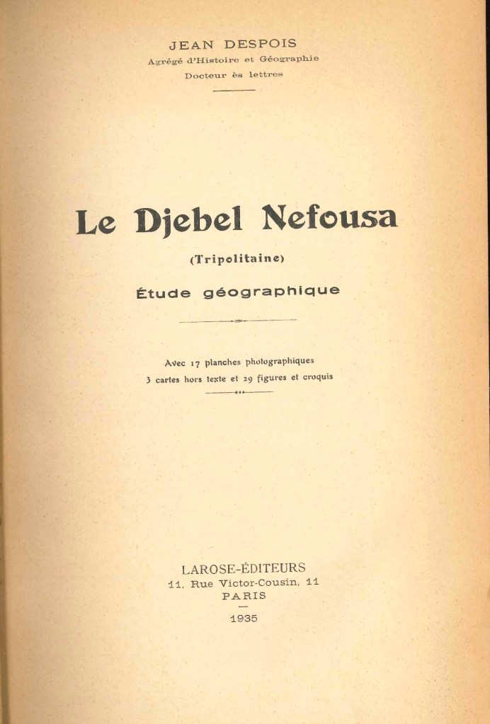 As I continue work on the history of the Jebel Nafusa, I like so many others before me have been engaging with the works of French geographer Jean Despois (1901-1978). Originally from France, Despois had been living in Tunis since 1924, teaching at the Collège Sadiki and editing the Revue Tunisienne. In 1935, Despois published his geographical study entitled Le Djebel Nefousa (Tripolitaine): Étude géographique. The study was one of a series of publications to result from his doctoral fieldwork in the Jebel Nafusa, which he carried out in 1932-33. I will be focusing on his work for the next few weeks and wanted to share a short post on a document relating to his fieldwork that I ran across recently.