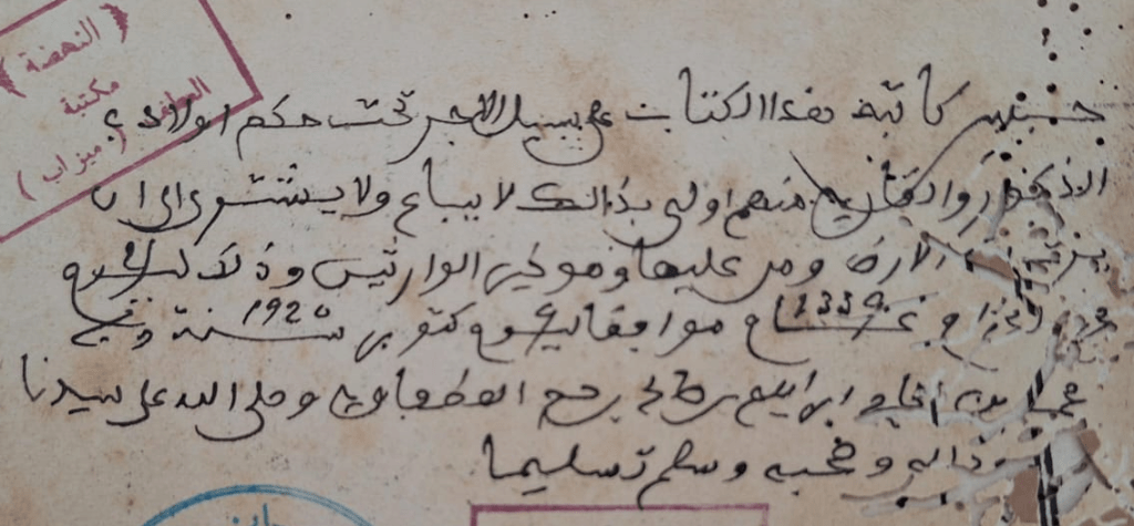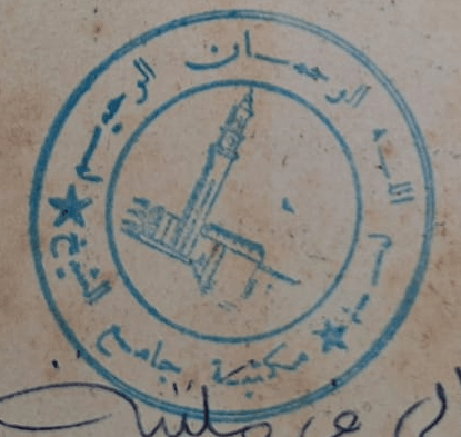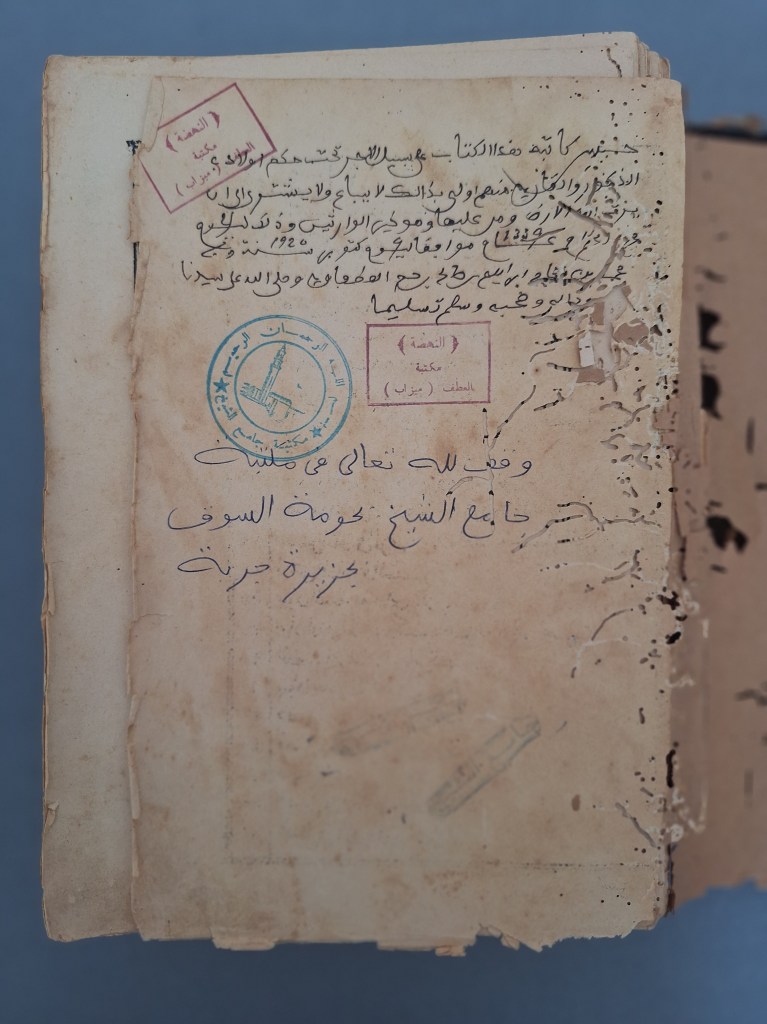 Now, like many of the books in this particular collection, this particular volume somehow came to Djerba from the Mzab valley and ended up at the Jami’ al-Shaykh. We will need some additional research both inside and outside the collection to figure out how it arrived in Djerba but the same page makes it clear they became part of an endowed collection there in the 20th century. The page bears both the blue ink stamp of the mosque (photo) and a handwritten endowment statement written in blue ink.
