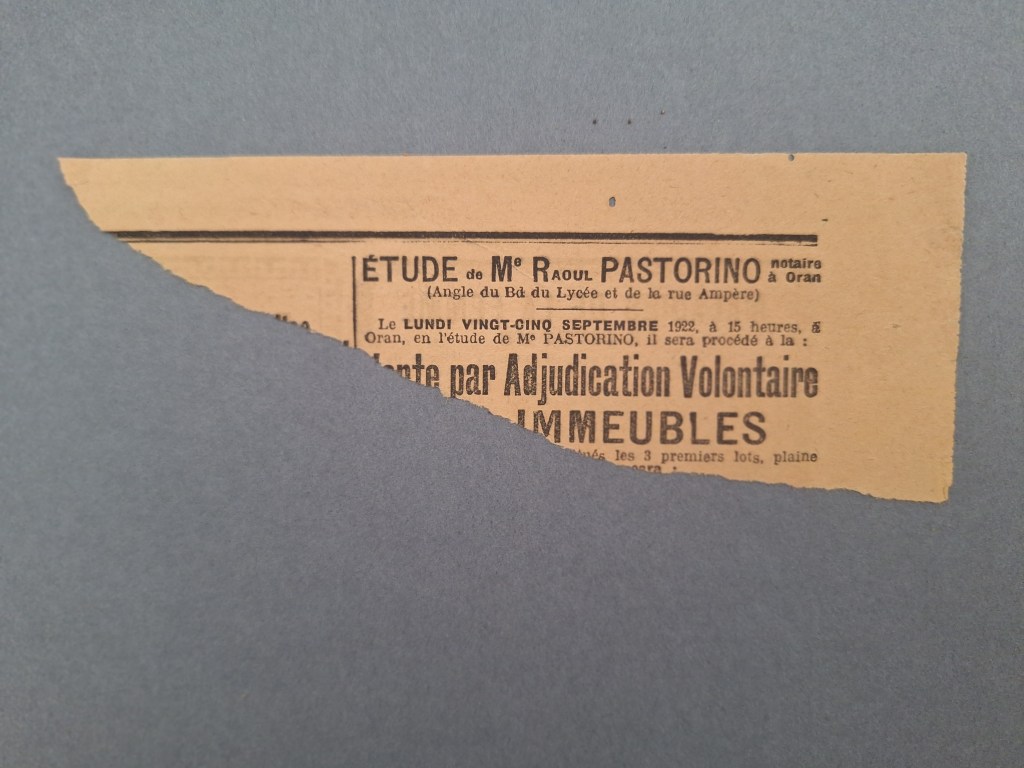 The second set of information about this book that interests me is the collection of papers that were placed between its pages, probably as bookmarks for their last reader(s). The first is a small fragment of French-language newspaper from Oran, Algeria, bearing the date 1922. Since this was two years after the endowment statement, presumably the reader who placed this in the book did so in the town of Ateuf (Algeria) some time in the 1920s. The second item is a sheet of lined notebook paper, bearing notes and questions written in a blue ink pen. This may well have been used during the study and discussion sessions after the books arrival in Djerba–perhaps it served as a list to question young learners?