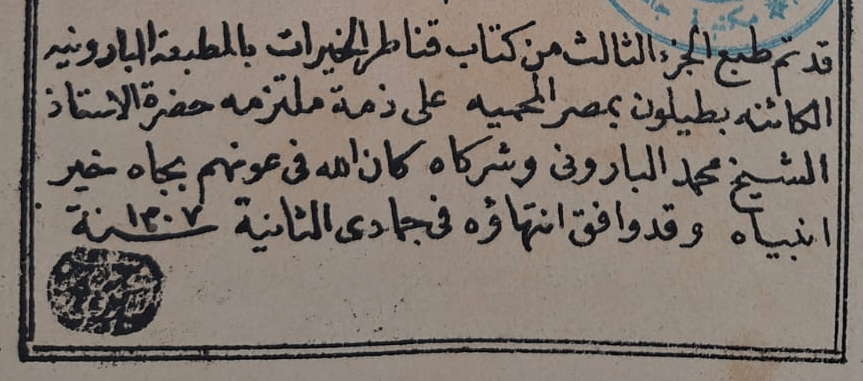 .طُبعت هذه النسخة في عام 1307هـ/1890م كما نقرأ في حرد متن الكتاب هنا (انظر الصورة)