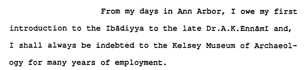 I wrote a post ten years ago about Dr. ‘Amr K. Ennami and his time at the University of Michigan in the 1970s. I may have known in the past and forgotten, but in reading Savage’s thesis I was struck to find that she had overlapped with Ennami at Michigan and it was he who introduced her to Ibadism. In the acknowledgements, she notes that it was Ennami who introduced her to Ibadism: