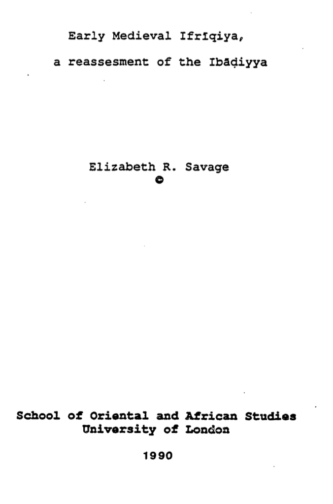 - Savage, E. R. (1990). Early medieval ifriqiya, a reassessment of the ibadiyya (Order No. 9235739). Available from ProQuest Dissertations & Theses Global. (303894870). Retrieved from https://www.proquest.com/dissertations-theses/early-medieval-ifriqiya-reassessment-ibadiyya/docview/303894870/se-2