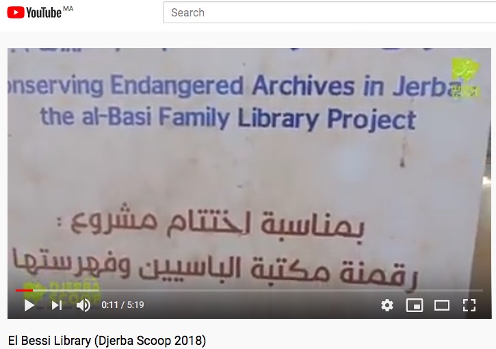 The El Bessi (al-Bāsī) family library originated as the library of the al-Bāsī Mosque in Djerba. Founded in the 18th century, the endowed mosque library came to include some 200 manuscript volumes of religious and natural sciences, Sufism, and much more. This project (EAP993) was supported by a Pilot Grant from the Endangered Archives Programme, funded by the Arcadia Foundation and administered by the British Library. The project was led by myself and my colleague, Dr. ʿAlī Būjdidid (Ali Boujdidi), a Professor of Arabic at the University of Gabes and director of the Association d’Animation Culturelle de Djerba. You can learn more about the project and soon will be able to access images of the entire library here: https://eap.bl.uk/project/EAP993. The videos and photos below show the equipment used and the process of cleaning and photographing the manuscripts, as well as the training sessions in which the EAP993 team members learned about codicology, manuscript conservation, cataloging, and digital photography. The videos also cover the public history exhibition on the collection held in 2018.