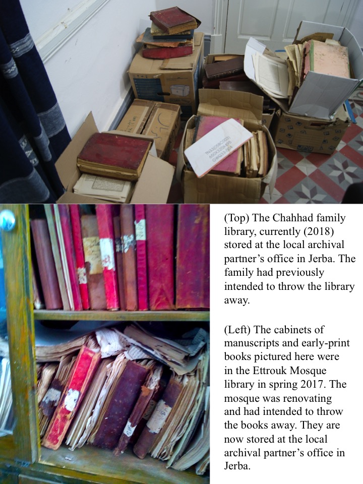 عبر عدة سنوات (بين 2015 و 2018)، قمت بفهرس مجموعة من المخطوطات في جمعية صيانة جزيرة جربة في مدينة حومة السوق. في الفهرس الناتج عن ذلك، وصفت المخطوطات المجلّدة وغير المجلّدة في المكتبة إضافة إلى بعض الوثائق والمواد المخطوطة الأخرى والفهرس موجود الآن على موقع المكتبة هنا. في الصور الآتية ترون عملية الجرد والفهرس وعملية وضع المخطوطات في الصناديق والملفات الأرشيفية الخاصة في عام 2018